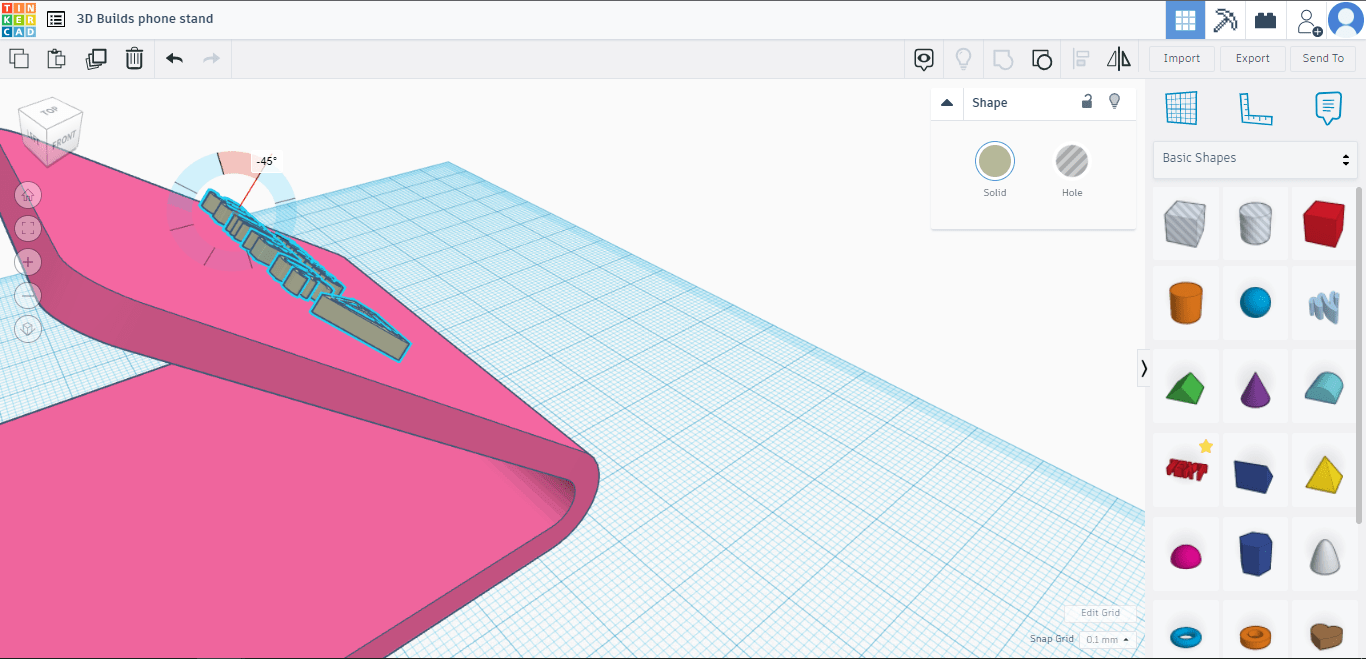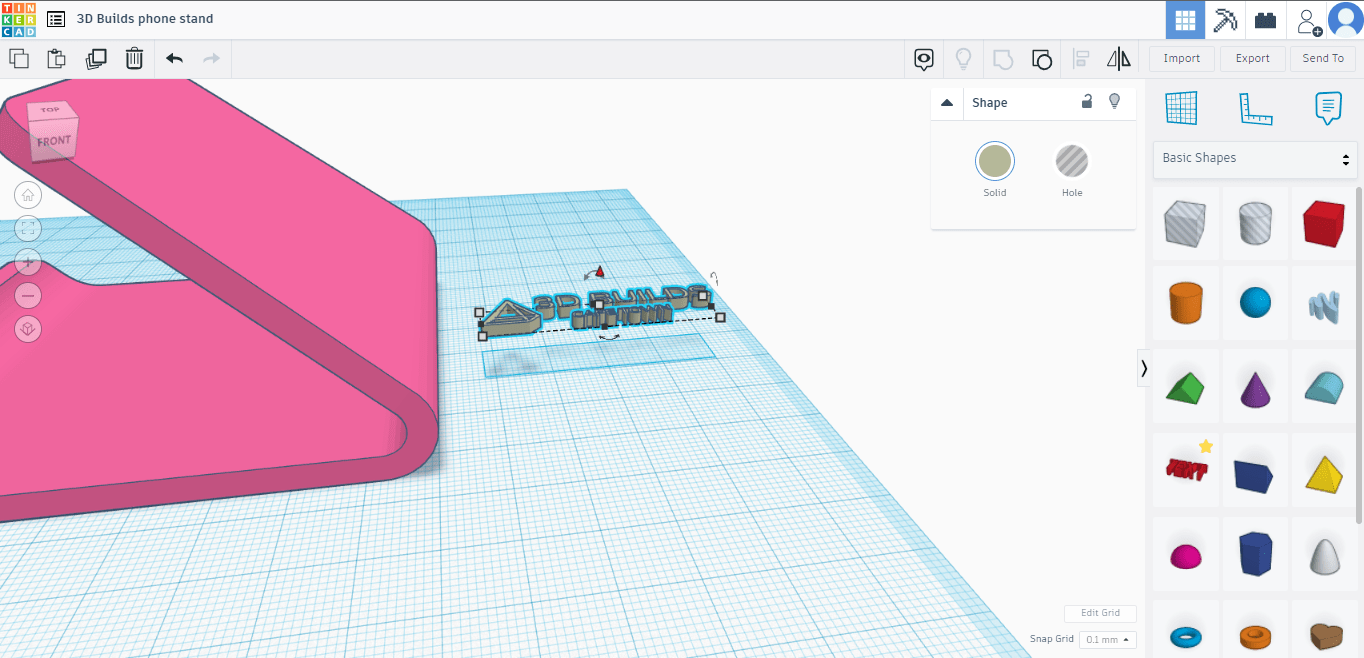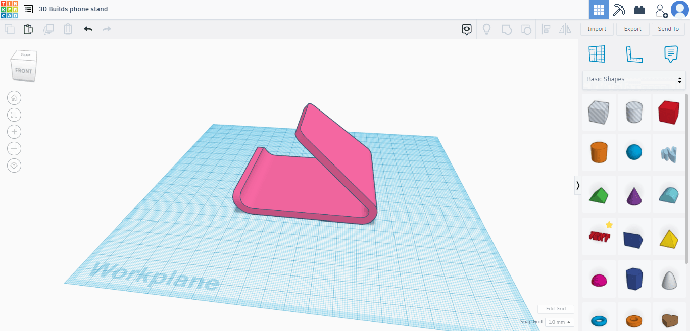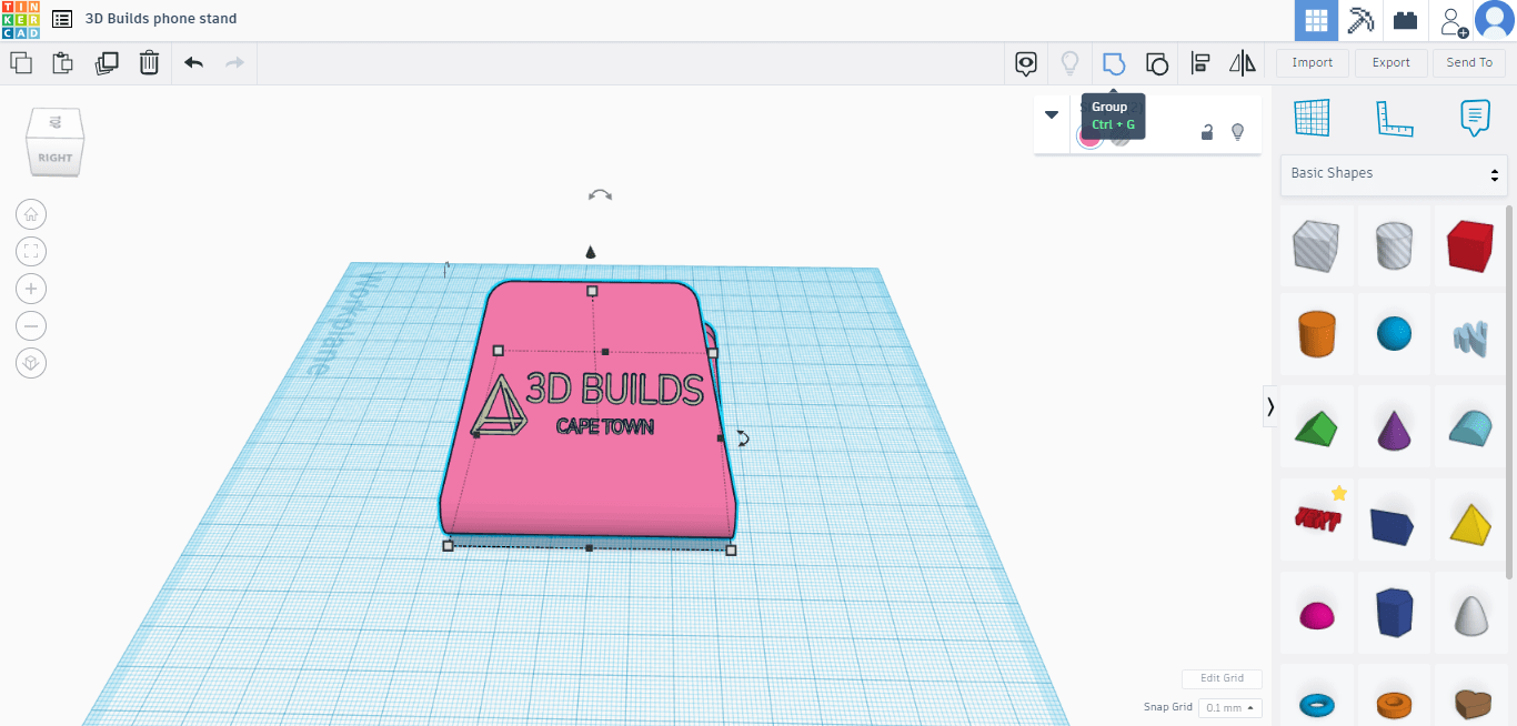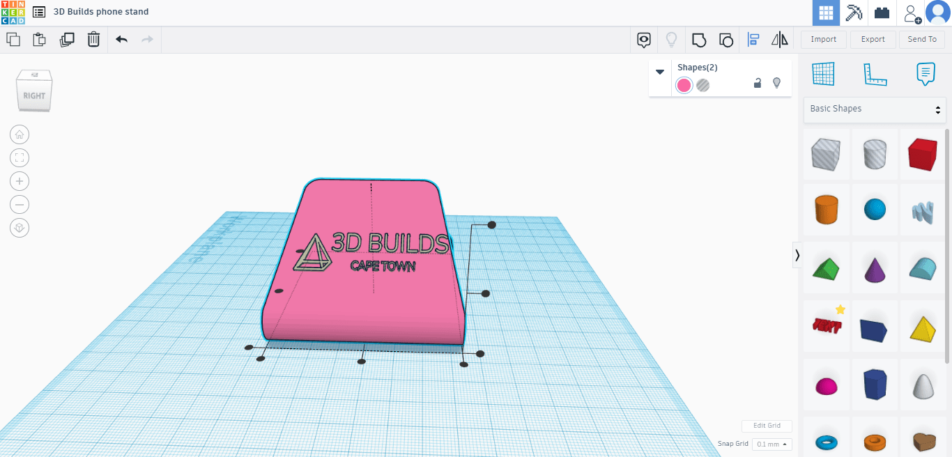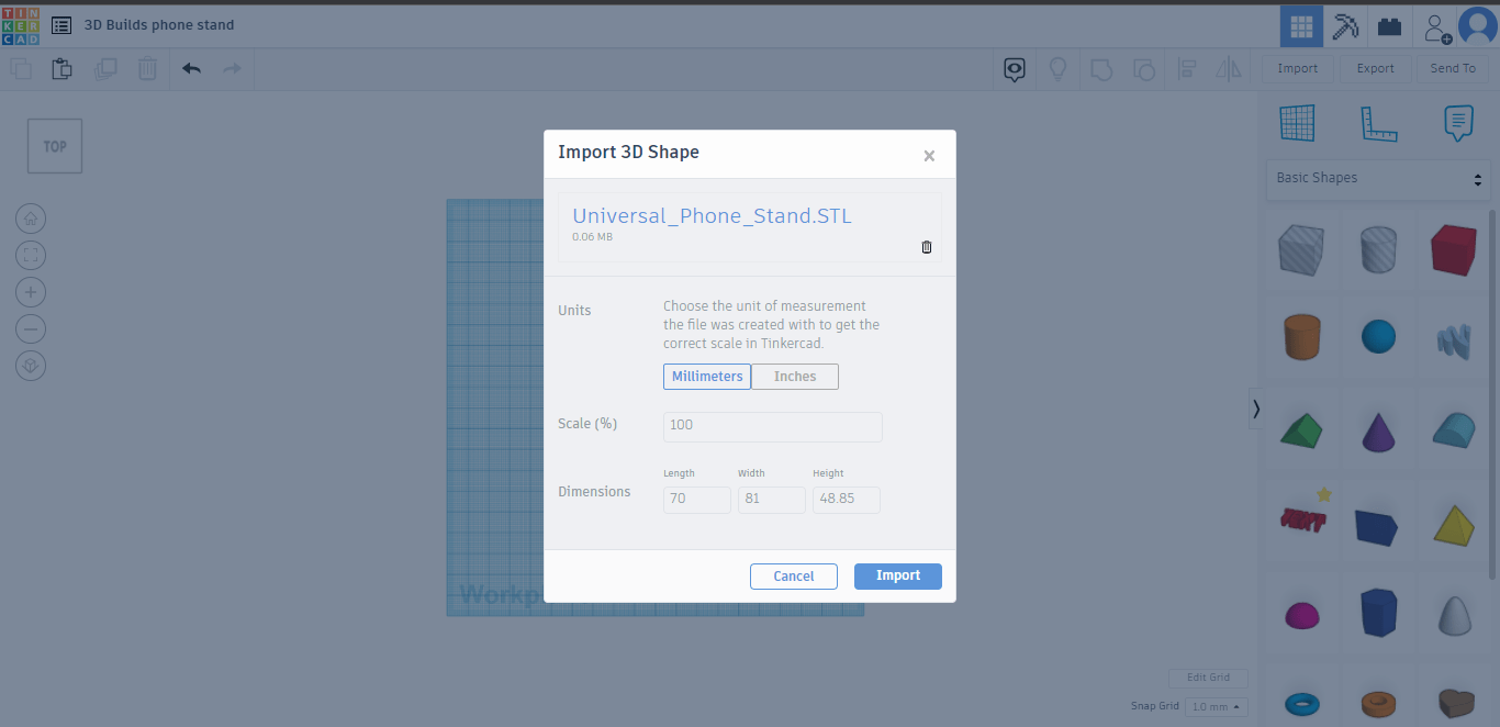 Firstly head over to TinkerCAD on your PC or Tablet. Create an account, sign up/log in and click “create new design”. You will then be taken to a blank workspace. The right tab has a bunch of different shapes you can drag and drop into the workspace. For this Tutorial we will be editing a Universal Phone stand from Thingiverse. Once you have the model click the IMPORT button on the top right(above the shape tab), it will then appear in your workspace.