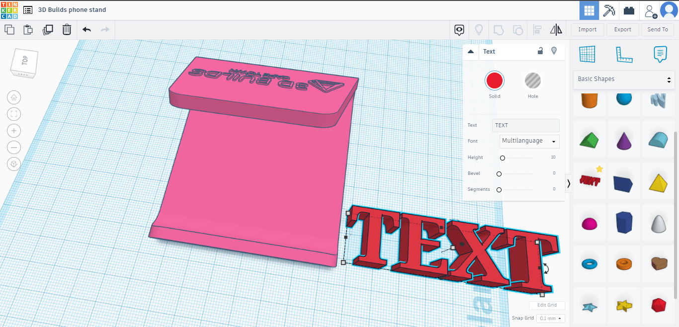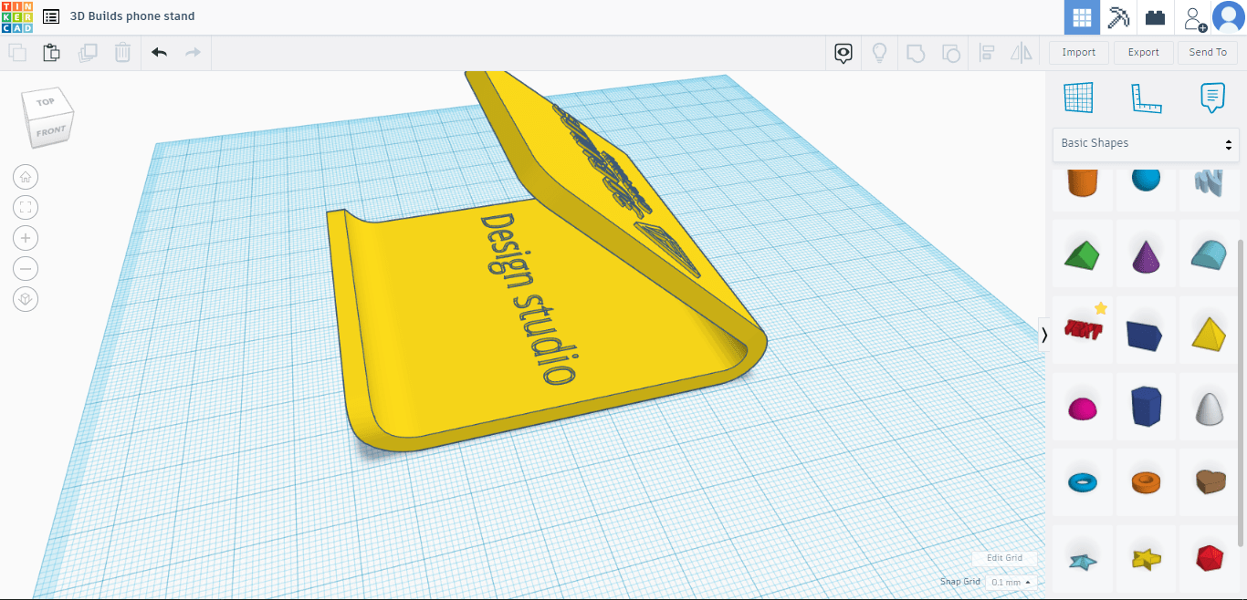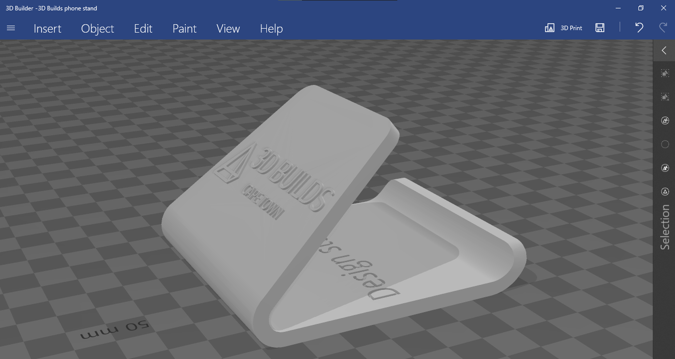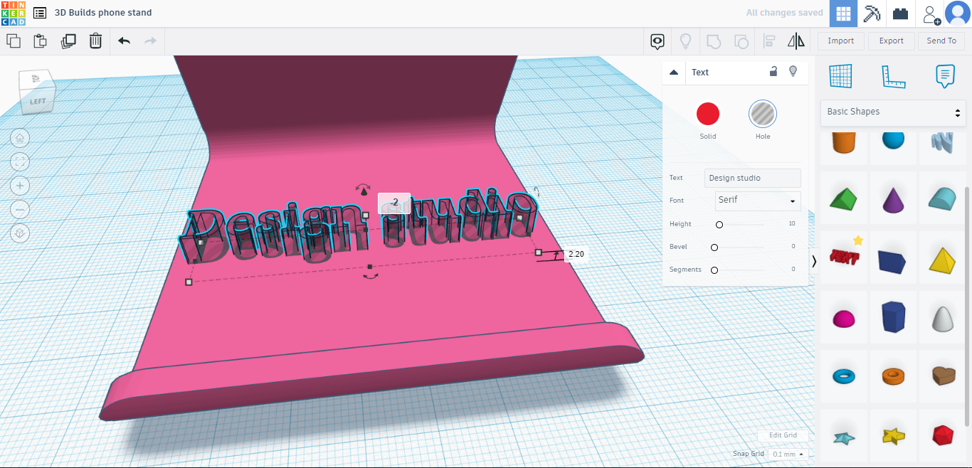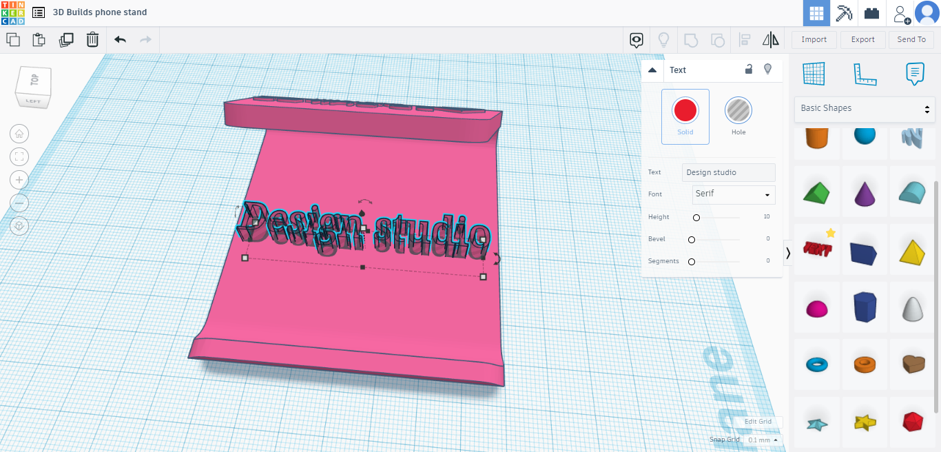 If you would like to add text inlay with a personal message click the “text” option in the right had toolbox with all the shapes(under basic shapes). With “text” selected there will be a pop-up box where you can change the text to whatever you’d like, change the font and importantly, you can change it from a solid to a hole. In this instance we will type in “design studio” as this is where our phone stand will live. Rotate and resize if necessary using the methods discussed earlier, move it to where you would like it on the base of the model, then raise is by at least 2mm(the base is 4mm thick). Align if necessary then group all the elements(CTRL+A, CTRL+G). Now click export on the top right bar, select STL and your model will download. If you’re using a PC with Windoows 10, you can open 3D Builder(available from the Microsoft store if not preinstalled) to view your model. If you would like us to print your model please click the button below.