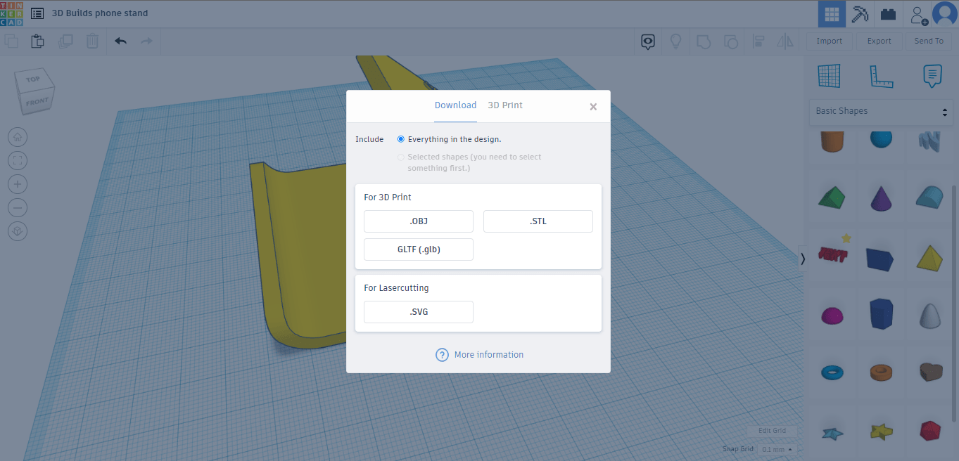 If you’re happy with what you have thus far, click the export button on the top right bar, select STL and your model will download.